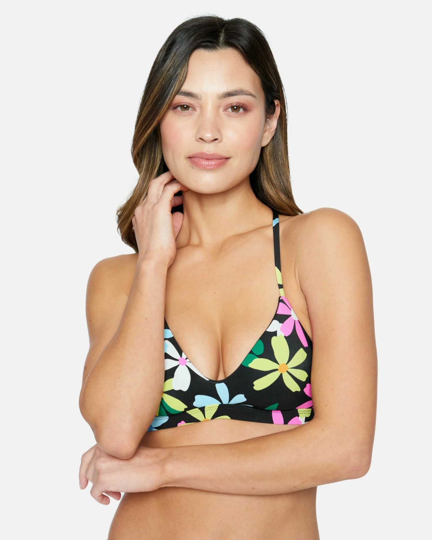 Bold, colorful, and beach-ready, the DAISY POP ADJUSTABLE BIKINI TOP features light compression support, a cinch front detail for a flattering fit, and is made from recycled polyester, making it earth friendly!