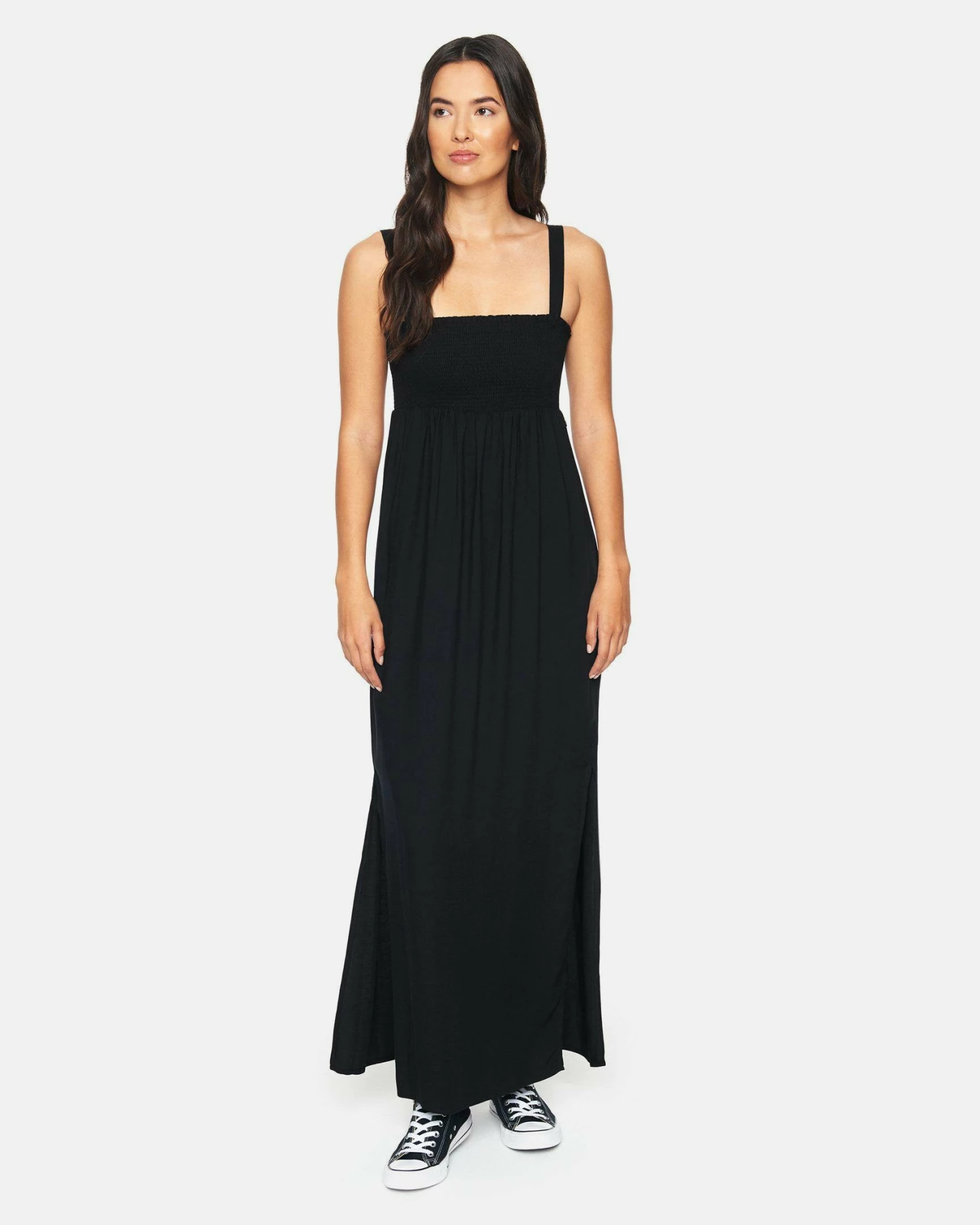 - Maxi dress with smocked top bodice and slit on wearers left seam.