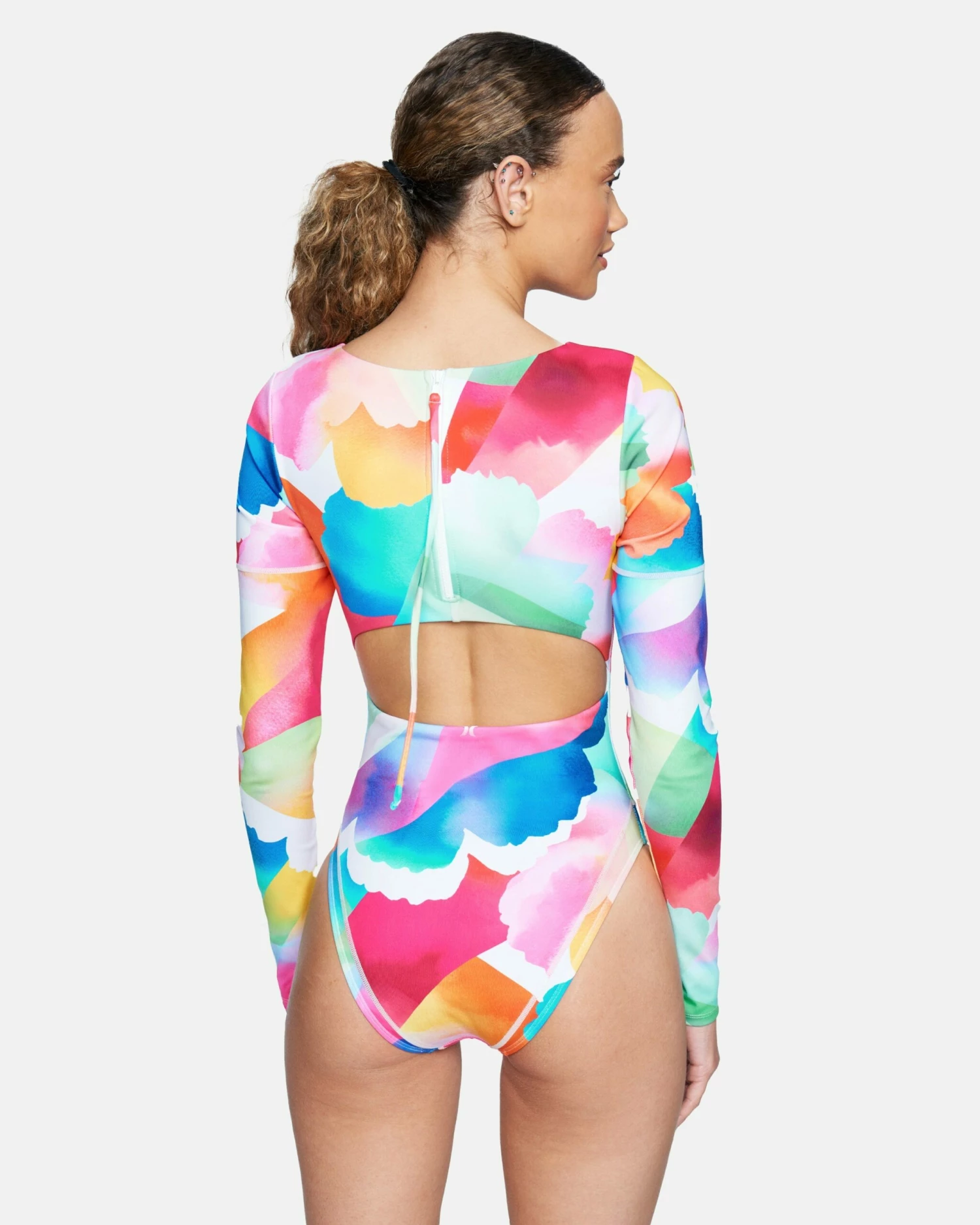 - All over printed long sleeve surf bodysuit with back zip entry.