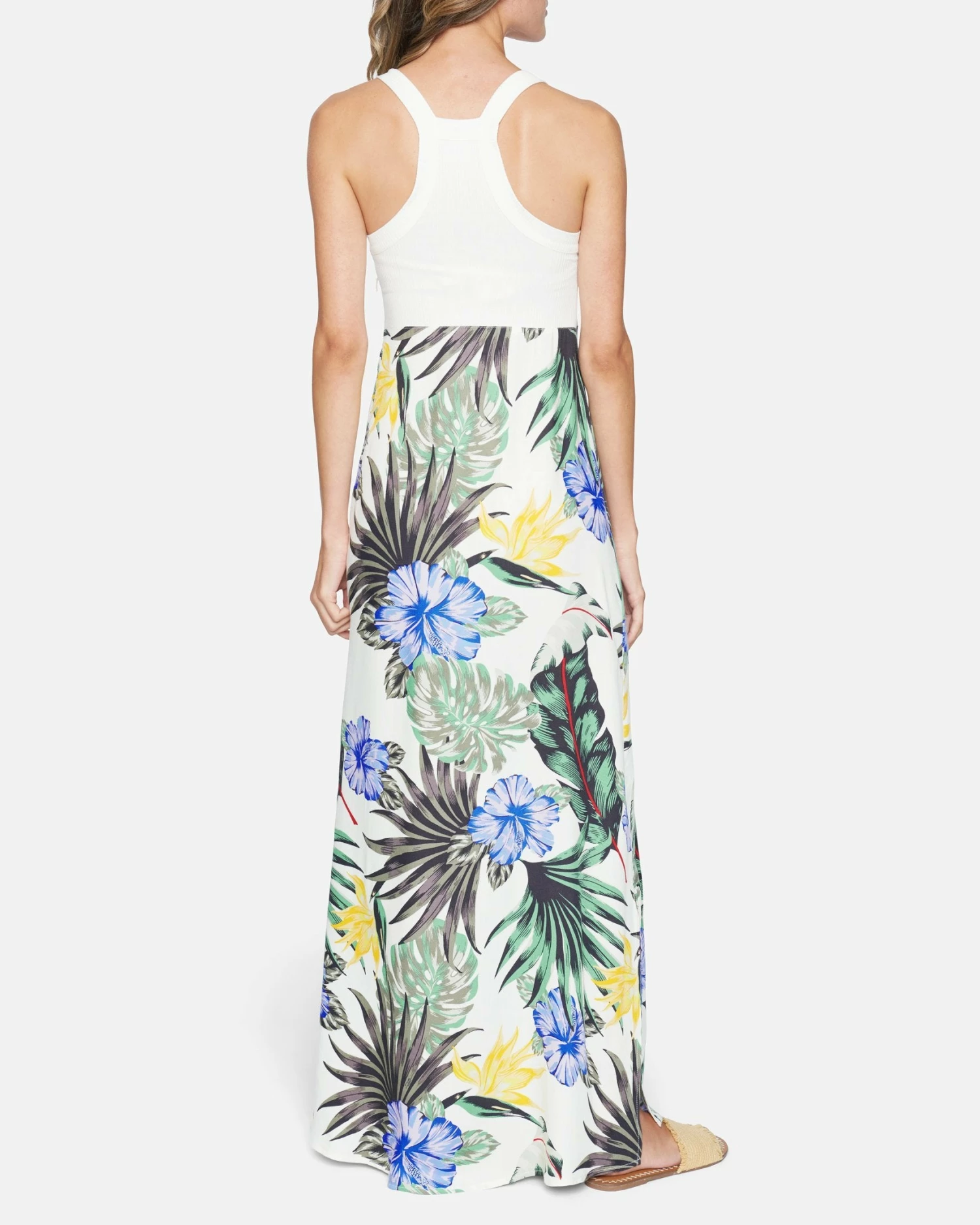 - Maxi dress with ribbed knit bodice and woven rayon skirt.